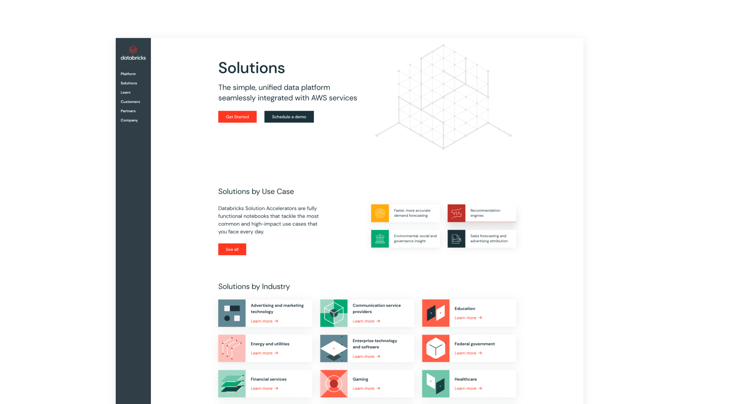 Databricks is a data and AI company, helping data teams — engineers, analysts and scientists to provide an open and unified platform for data management, business analytics, and machine learning. We collaborated with the Databricks team to explore and establish an effective and cohesive brand expression across their website to better be able to speak to their customers and core audiences. This included iconography, photography, color, typography, and graphic treatments to better be able to communicate with their core audience of researchers and engineers.