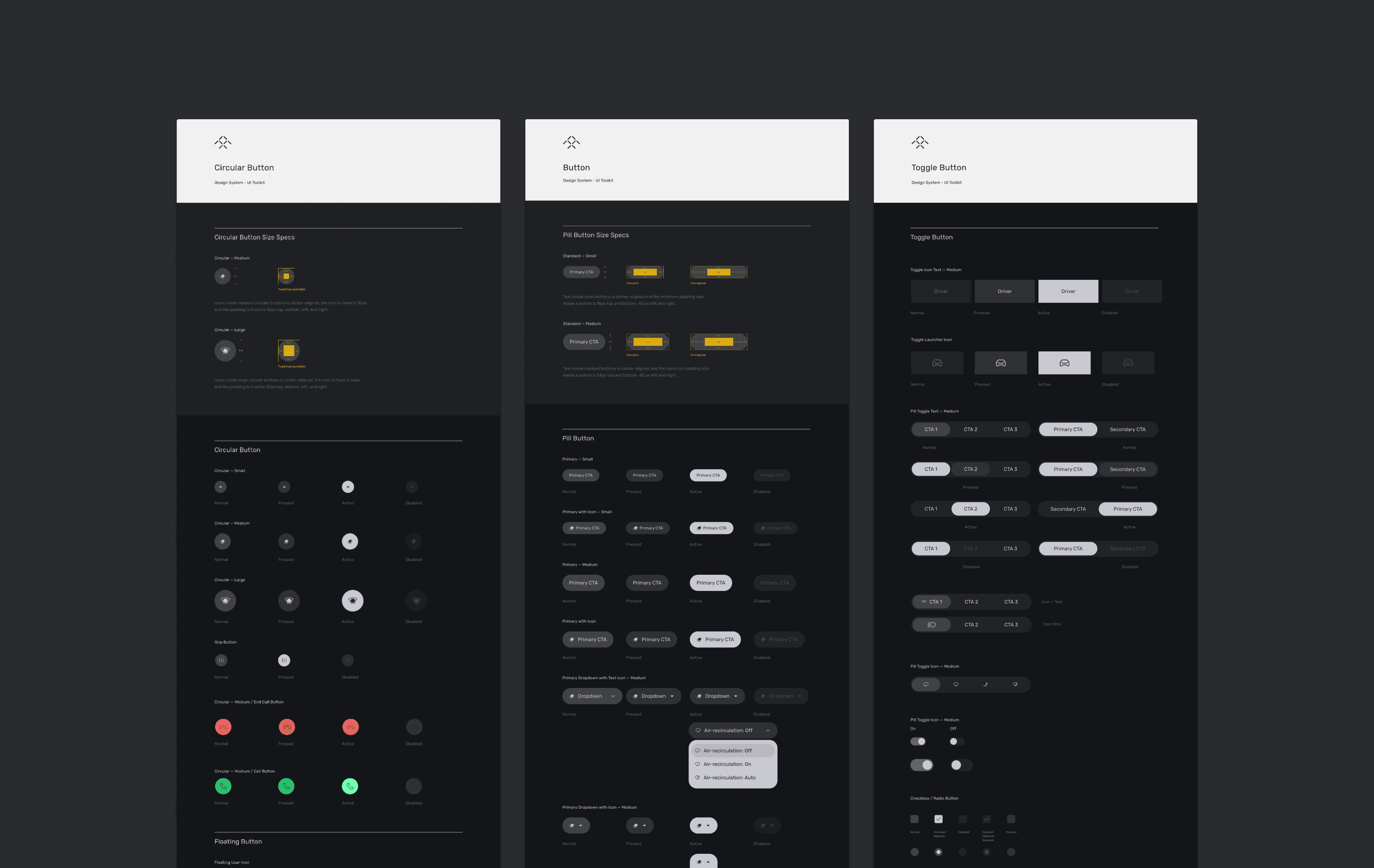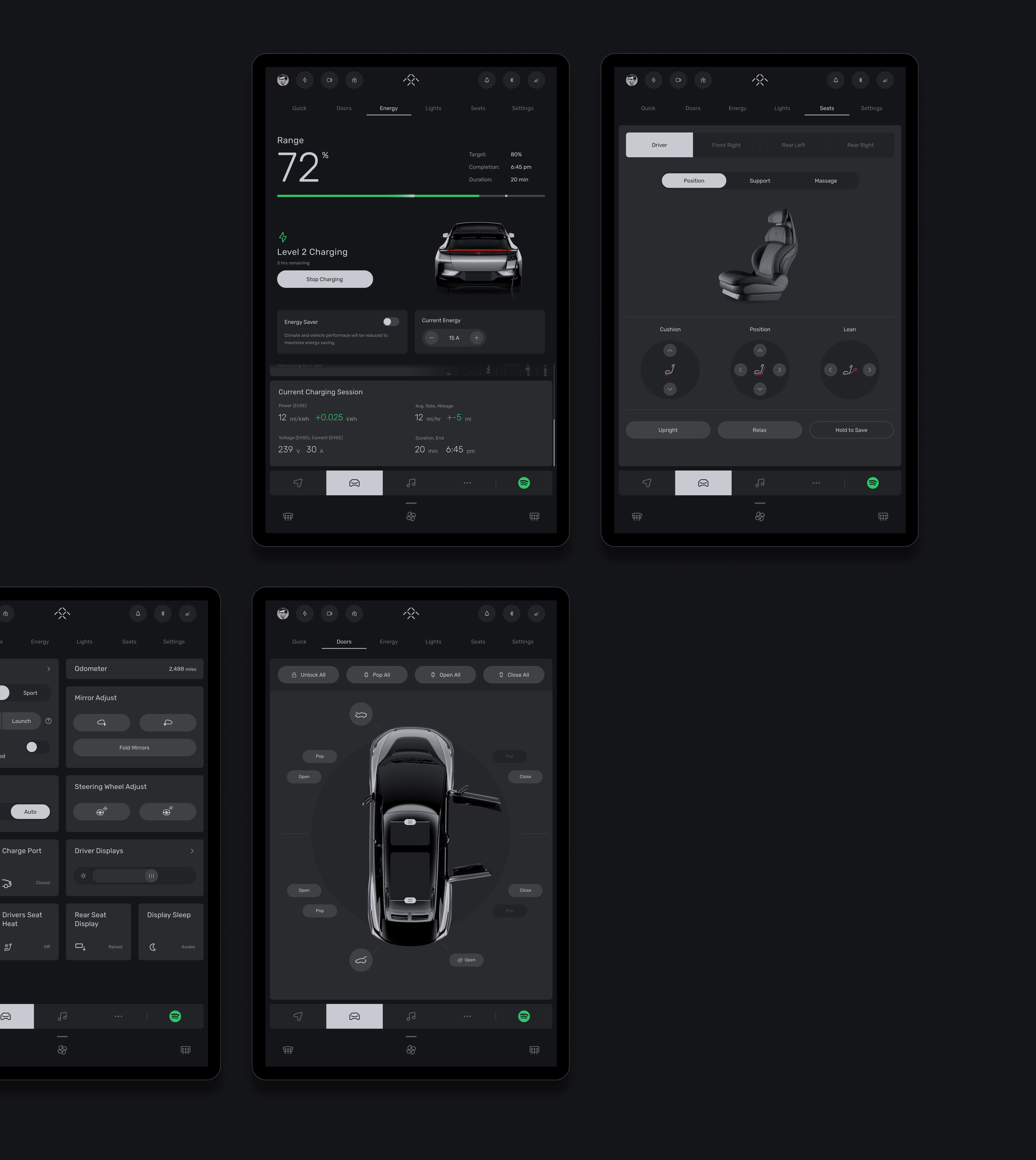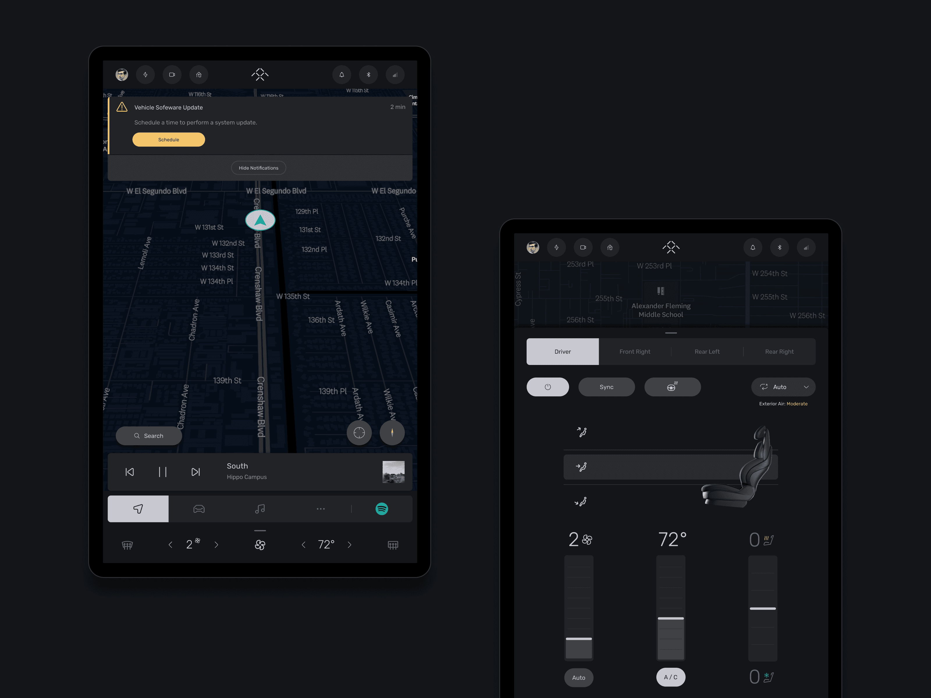 We established clear visual hierarchy across three functional bars — status, launcher, and climate. Multi-tasking functions were consolidated into a compact area that adapts across all sections. Climate controls were restructured for clarity, with ambiguous interactions replaced by directive ones first-time users can understand immediately. Vehicle controls were simplified into a cohesive system with refined iconography that better communicates each function.