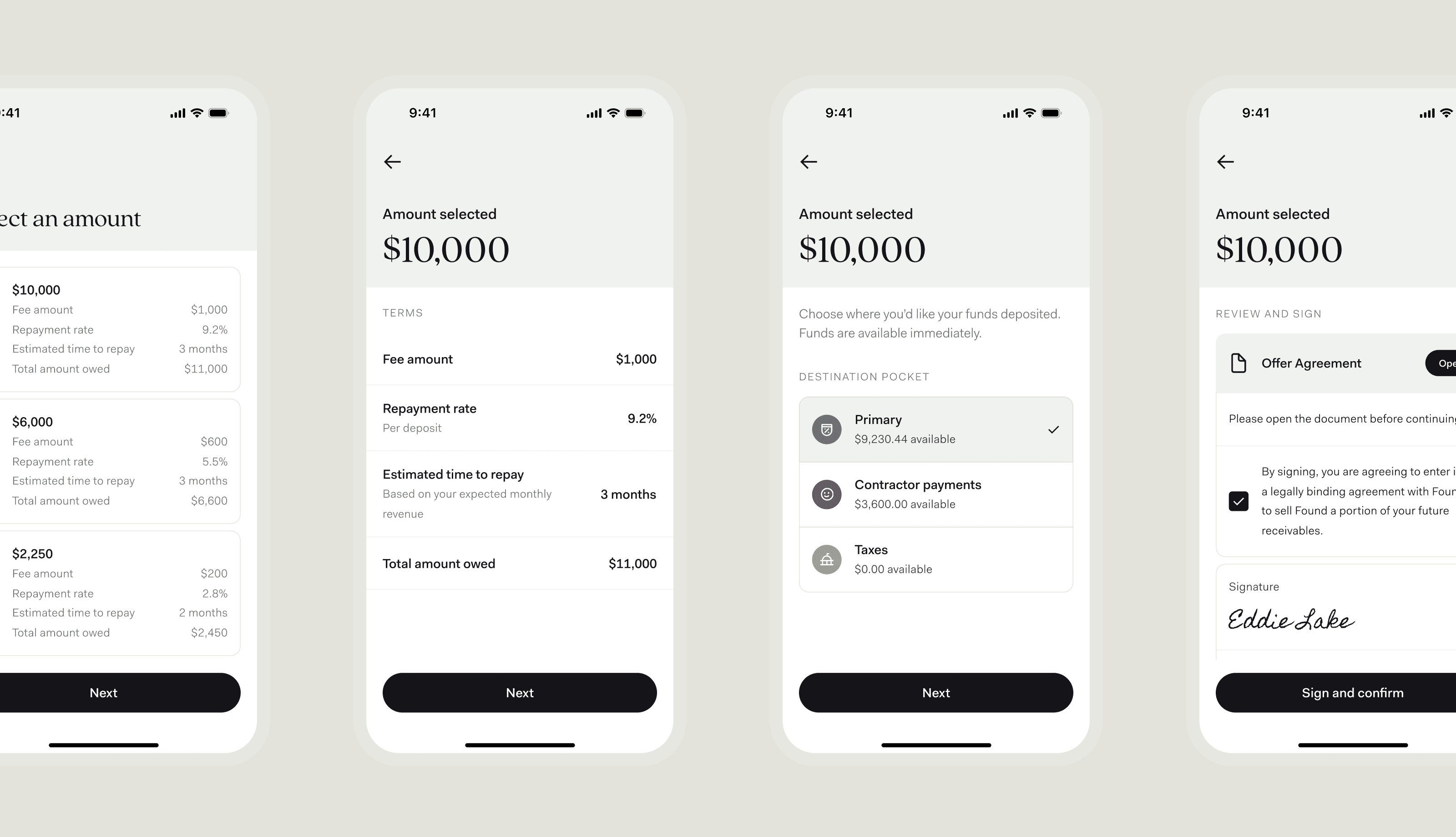 Found set out to build its first credit product — a cash advance pilot to validate customer need and gather insights to scale. I designed the full user journey end-to-end, from offer discovery and acceptance to repayment experience, working closely across product, engineering, legal, and finance.